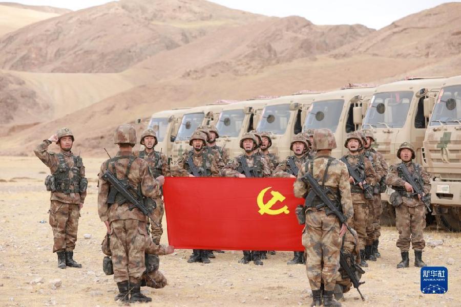 聯(lián)勤保障部隊汽車運輸某團(tuán)一營一連在高原執(zhí)行運輸任務(wù)時,利用休息間隙組織官兵重溫入黨誓詞(5月10日攝)。新華社發(fā)