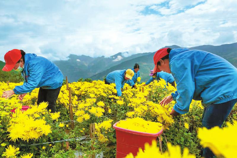 位于涼山州木里縣喬瓦鎮(zhèn)簸箕籮村的農(nóng)業(yè)產(chǎn)業(yè)示范園里,村民正忙著采摘金絲皇菊。李正國攝