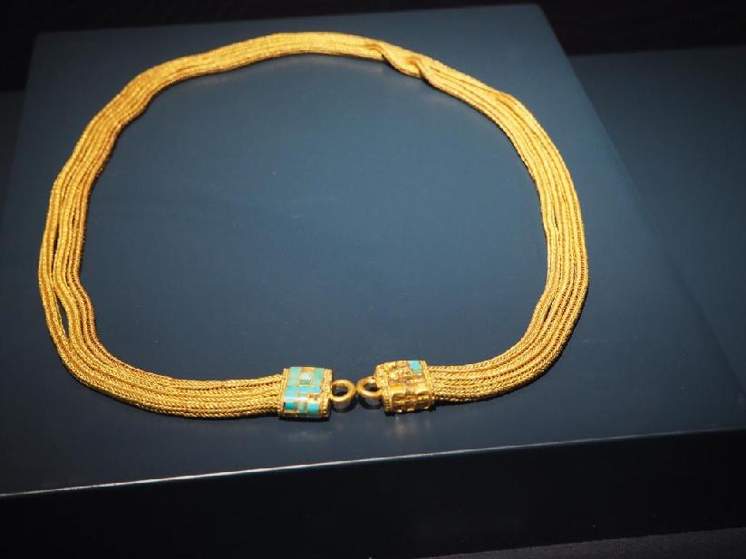 這是11月24日拍攝的出土于2018血渭一號墓的鑲綠松石金鏈。新華社記者 白瑪央措 攝