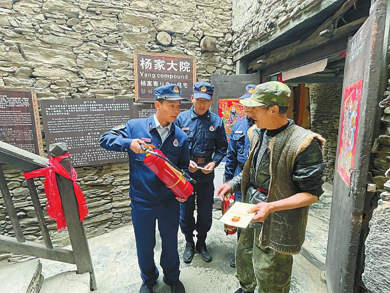 在被譽(yù)為“羌族建筑藝術(shù)活化石”的桃坪羌寨,羌族每家都設(shè)“火塘”,羌寨內(nèi)部采用木材構(gòu)造,稍有不慎極易引發(fā)火災(zāi)。到寨子組織滅火演練、開展防火巡查、宣傳消防知識(shí)、提供便民服務(wù),就成了陳洪橋和戰(zhàn)友們每天雷不打不動(dòng)的事,“一定要注意用火用電!”“老鄉(xiāng),請(qǐng)記得‘人走火滅’哦!”“你好,需要幫助嗎?”……這是他們每天不厭其煩對(duì)寨中群眾和游客重復(fù)最多的話。寨中每一條疏散通道、每一條暗溝水渠以及每一家房子結(jié)構(gòu)布局,消防員們都了然于胸、爛熟于心。