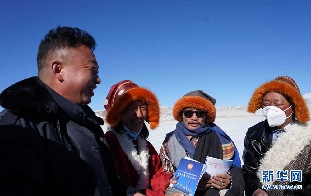 12月20日,青海省果洛藏族自治州瑪多縣人民法院院長錢快乾(左一)在雪后草原上為當地牧區(qū)群眾普及法律知識。新華社記者 李寧 攝