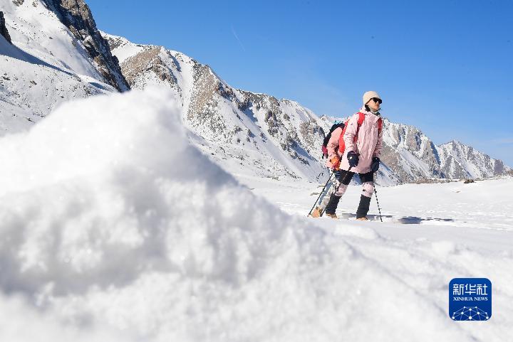 當日,在青海省海北藏族自治州門源回族自治縣,登山愛好者們攀登崗什卡雪峰,在山巔和雪原中度過新年第一天。