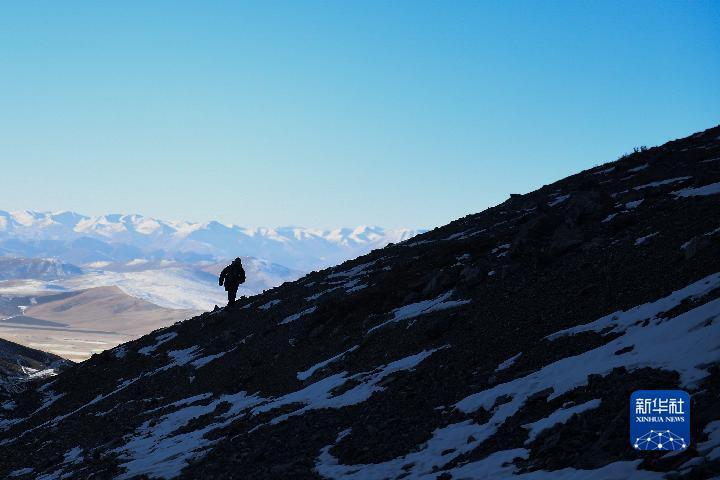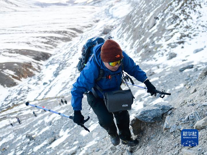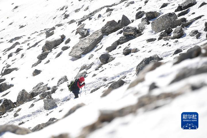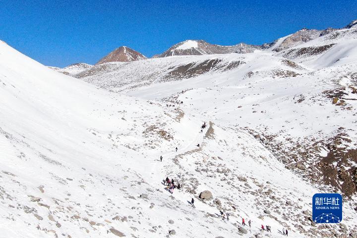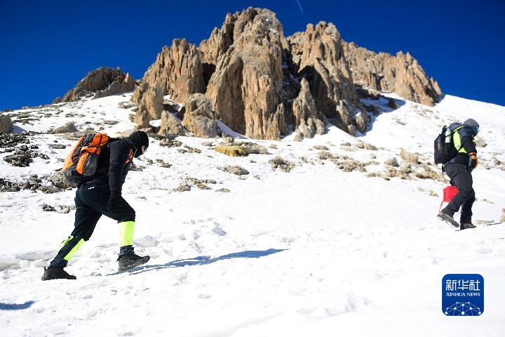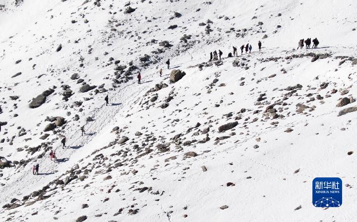 1月1日,登山愛好者攀登崗什卡雪峰(無人機照片)。
