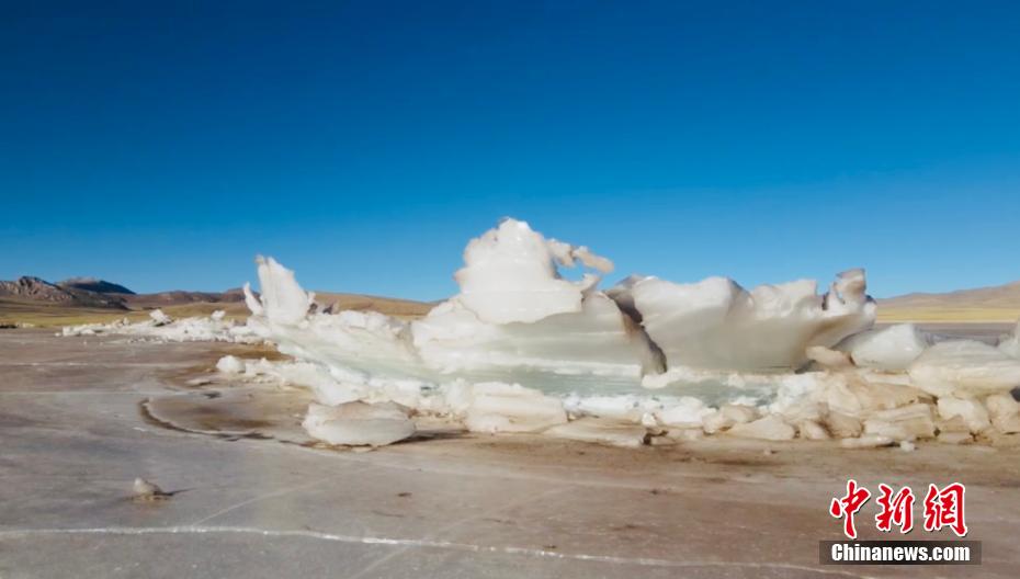航拍長江源頭班德湖封湖 如同冰上長城