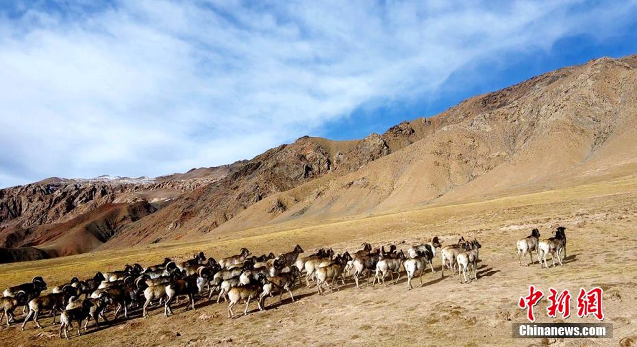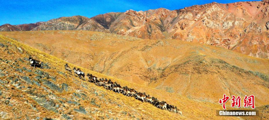 近日,攝影愛好者在地處柴達(dá)木盆地的青海省海西州都蘭縣香加鄉(xiāng)山區(qū)拍到成群盤羊。