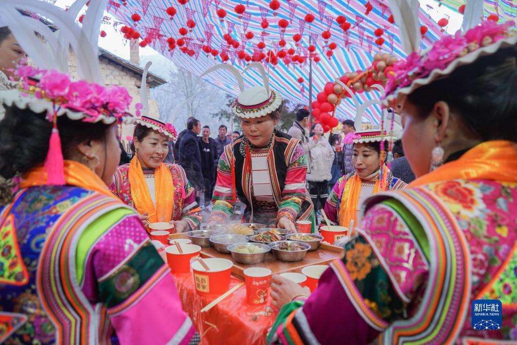 1月13日,在隴南市文縣鐵樓藏族鄉(xiāng)寨科橋村的白馬藏族婚禮上,賓客在宴席上享用美食。新華社記者 郎兵兵 攝