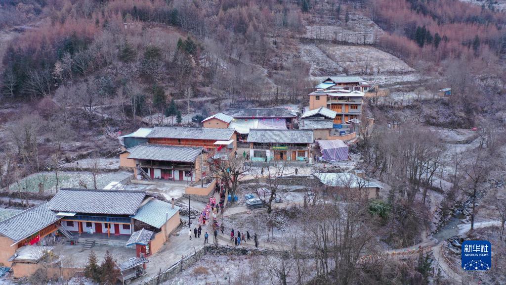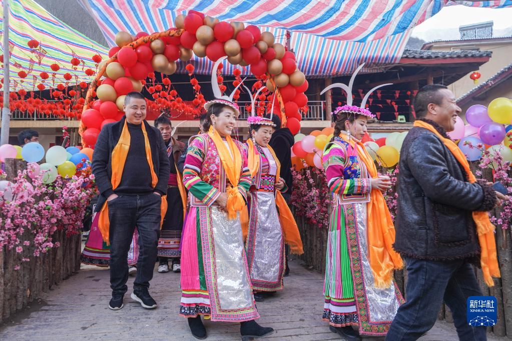 1月13日,在隴南市文縣鐵樓藏族鄉(xiāng)寨科橋村的白馬藏族婚禮上,宴席結(jié)束后賓客到村寨中走親訪友。新華社記者 郎兵兵 攝