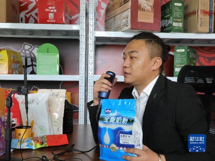 1月25日,網(wǎng)絡(luò)主播騰格爾在直播間為粉絲們介紹來自家鄉(xiāng)的農(nóng)畜產(chǎn)品。新華社 央秀達(dá)珍 攝