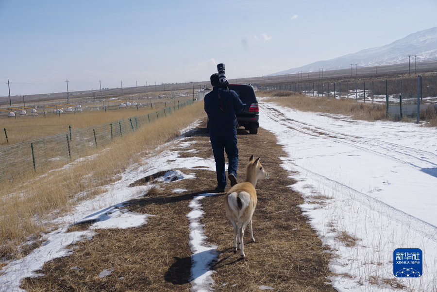 2月11日,吳永林正在和普氏原羚“東東”一起在保護(hù)站內(nèi)巡查。新華社記者 周盛盛 攝