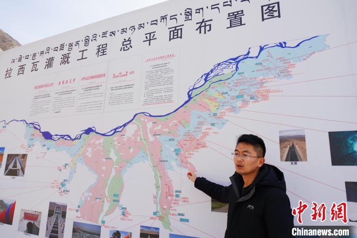 圖為貴德縣拉西瓦灌溉工程管理局副局長方軍介紹工程詳情。馬銘言 攝