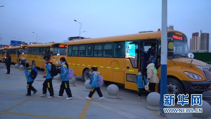 開(kāi)學(xué)第一天,蘭州新區(qū)第二小學(xué)學(xué)生乘坐校車上學(xué)。新華社記者 王紫軒 攝