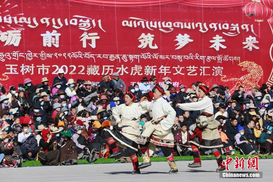 3月3日,在青海省玉樹藏族自治州玉樹市,藏族民眾進(jìn)行歌舞表演,共慶藏歷水虎新年。當(dāng)日是藏歷水虎新年正月初一,玉樹市藏族民眾身穿華麗服裝,跳起歡快的藏族舞蹈,共慶藏歷水虎新年。部分民眾來到嘉那瑪尼石經(jīng)城轉(zhuǎn)經(jīng)朝拜,煨桑祈福新的一年五谷豐登、吉祥如意。 中新社記者 馬銘言 攝