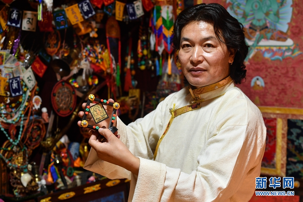 同仁市“脫貧攻堅(jiān)社會(huì)扶貧先進(jìn)個(gè)人”、黃南州“優(yōu)秀共產(chǎn)黨員”、青海省“綠色家庭示范戶”……近年來(lái),格桑嘉措不僅通過(guò)自己的努力,帶動(dòng)當(dāng)?shù)刎毨艟偷貏?chuàng)業(yè),還積極投身各項(xiàng)公益活動(dòng)中,自2014年至今,已累計(jì)捐款捐物72萬(wàn)元。圖為格桑嘉措在唐卡展廳內(nèi)整理他創(chuàng)作的文創(chuàng)產(chǎn)品。