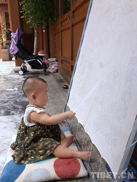 仁青多杰自己也有兩個女兒,大女兒已經(jīng)快五歲了,受家庭環(huán)境熏陶,從會走路時起,就喜歡拿毛筆,也非常喜歡畫畫。仁青多杰和父親每天都在畫畫,有一次在北京,仁青多杰的一幅唐卡快要完成了,女兒趁著中午大人們吃飯的間歇,跑出去拿著毛筆和顏料自己畫。那幅畫仁青多杰一直保留在北京,準備等女兒長大后送給她。