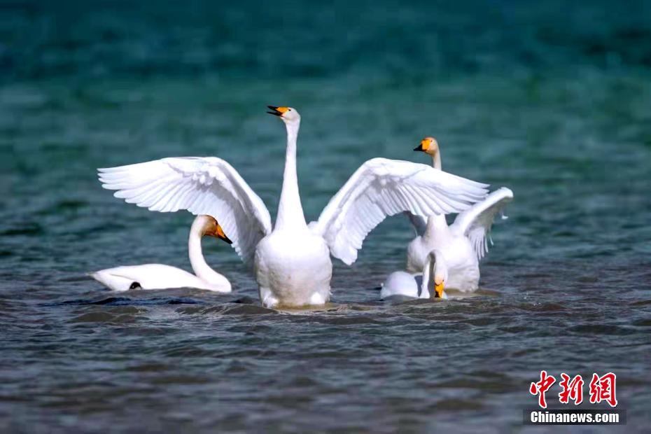 青海湖畔大天鵝集體“泡湯”畫面唯美
