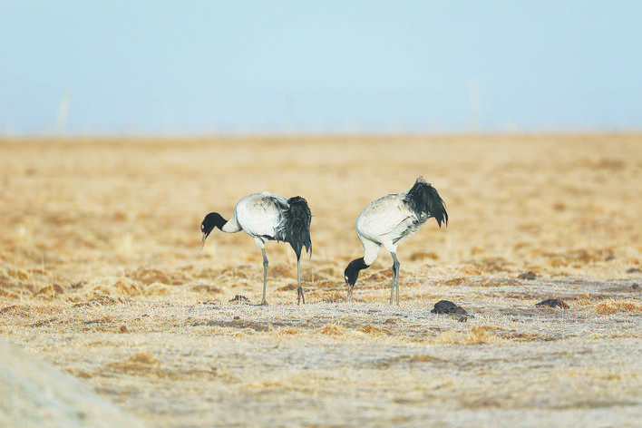 3月28日,早上八點(diǎn)左右,記者來到監(jiān)測站外,遠(yuǎn)遠(yuǎn)就看見一對黑頸鶴在悠閑地散步。如科夫婦笑容滿面,手捧哈達(dá),一邊呼喚著“阿克窮拉(藏語,意為親愛的黑頸鶴),你們一路辛苦啦”,一邊緩緩地走上前去。讓人驚訝的是,黑頸鶴夫婦并未驚動(dòng),心領(lǐng)神會(huì)地踱步觀望,轉(zhuǎn)而低頭覓食。