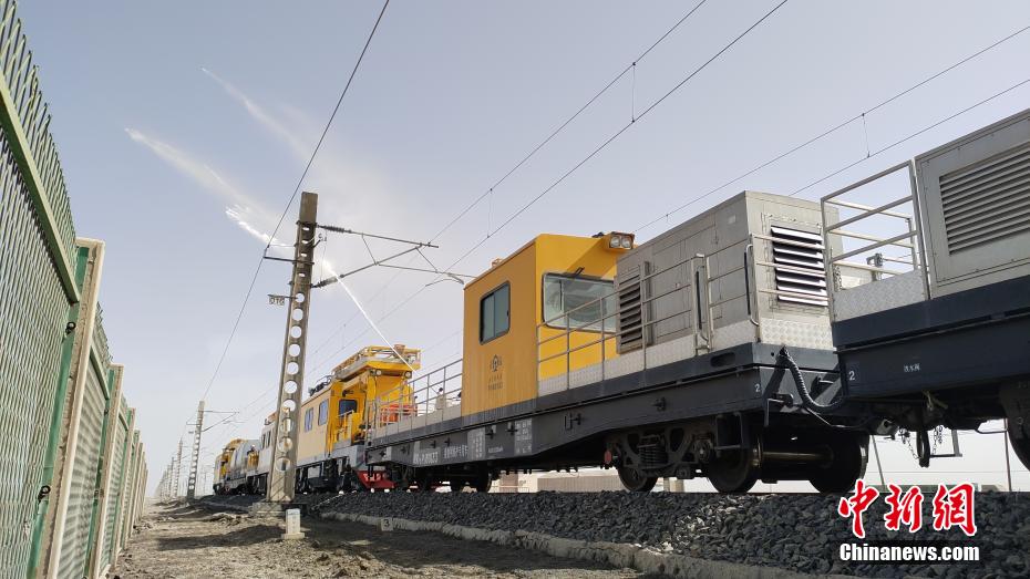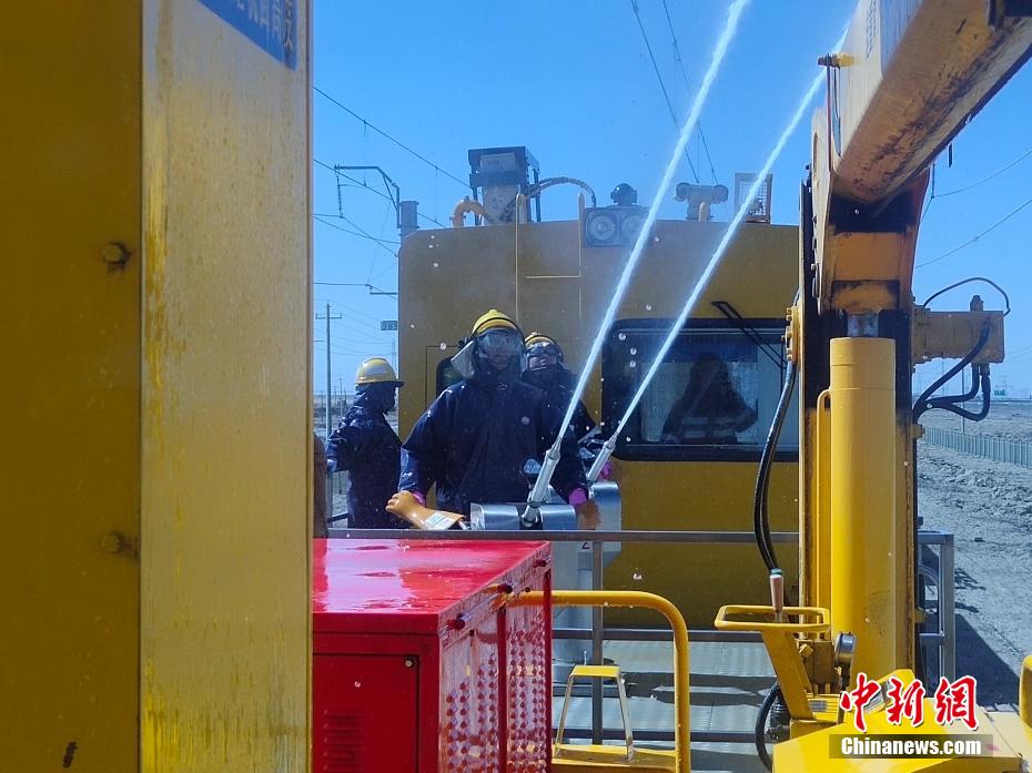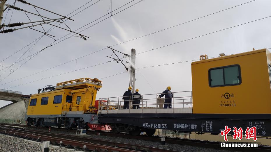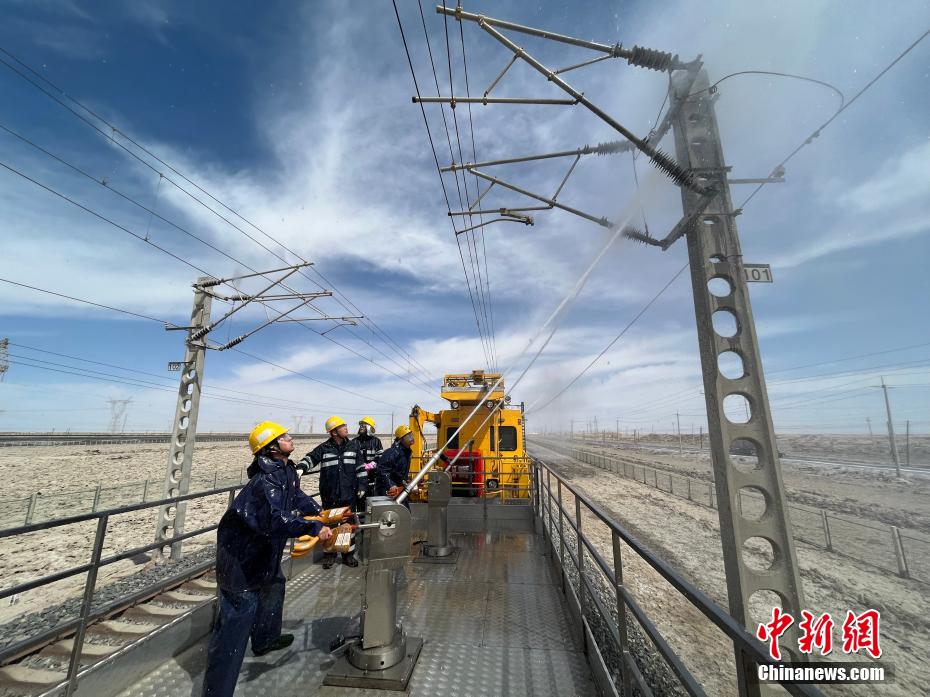 察爾汗鹽湖區(qū)域空氣中鹽分含量高,在這片區(qū)域,春秋季大風(fēng)不僅揚(yáng)沙還會(huì)揚(yáng)鹽,很容易在鐵路牽引供電接觸網(wǎng)設(shè)備上形成鹽污,造成線路跳閘,遇到雨雪天氣就會(huì)放電,造成大面積跳閘,誘發(fā)行車安全事故。圖為接觸網(wǎng)工操作水炮進(jìn)行清洗作業(yè)。 王文誠(chéng) 攝