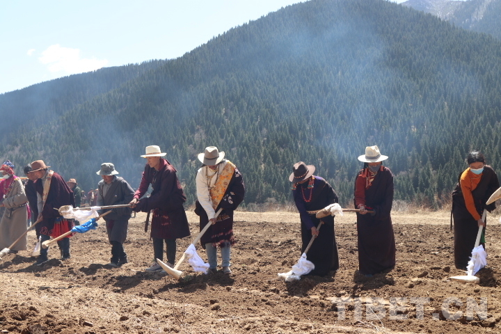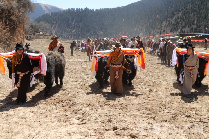 農(nóng)牧民群眾身穿節(jié)日盛裝,相聚在農(nóng)田里,端著預(yù)示豐收的黑青稞,捧著潔白的哈達(dá),牽著耕牛,開著輪式拖拉機齊聚田間地頭舉行開耕歡慶儀式。