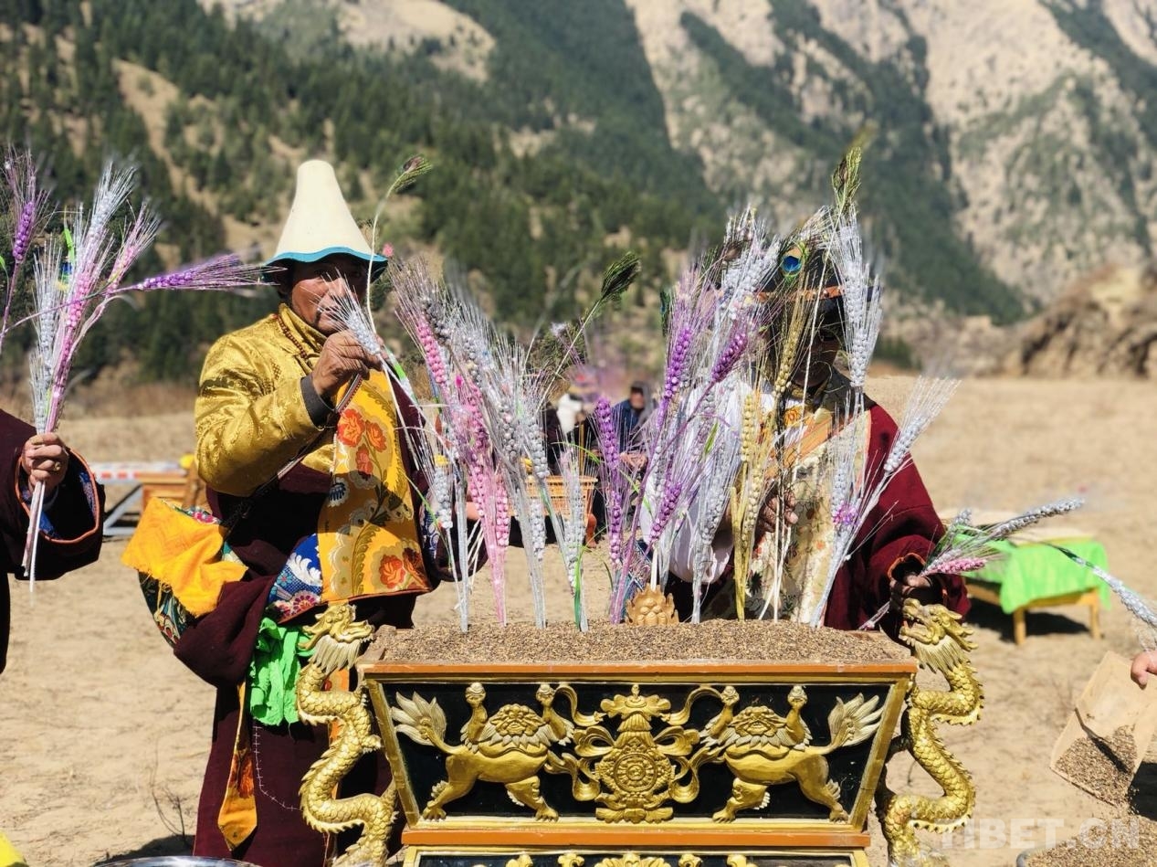 儀式上,青海省班瑪縣燈塔鄉(xiāng)要什道村村民代表洛次唱誦吉祥詞,祈求新的一年風(fēng)調(diào)雨順,五谷豐登。