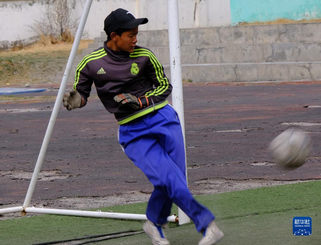 4月18日,稱多縣文樂中心寄校足球社團的學(xué)生在守門。新華社記者 央秀達珍 攝