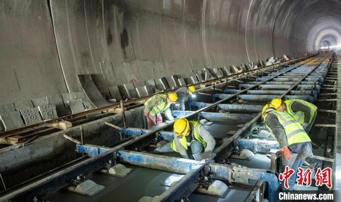 隧道內(nèi)工人師傅正在進行無砟道床施工。劉忠俊 攝