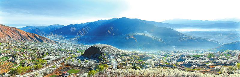 金川縣萬畝梨花綻放,雪白的梨花與藍天、白云、民居、碉樓共同繪出一幅“世外梨園”的美景,綿延百余公里。 (金川縣委宣傳部供圖)