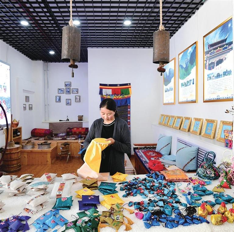 德琴巧手民俗文化旅游發(fā)展貿(mào)易有限公司負(fù)責(zé)人寧菊英正在繡香包。 新甘肅·甘肅日報記者 韋德占
