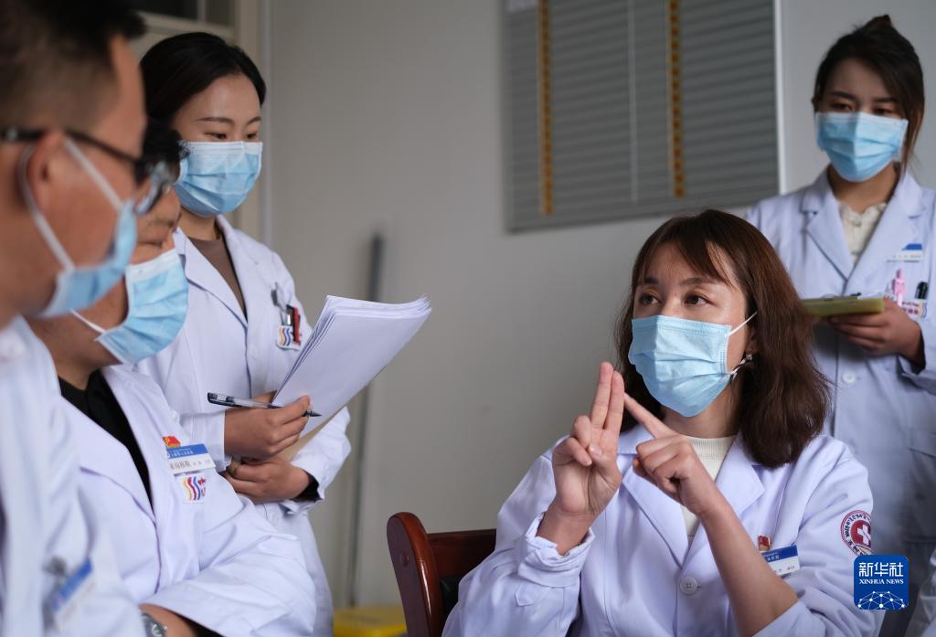 青海省人民醫(yī)院醫(yī)生、青南支醫(yī)隊(duì)員謝延玲(右二)和玉樹(shù)藏族自治州人民醫(yī)院醫(yī)生探討患者病情。新華社記者 央秀達(dá)珍 攝