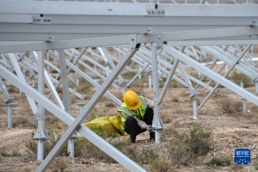 6月7日,在國家電投集團(tuán)黃河公司德令哈220萬千瓦多能互補(bǔ)項(xiàng)目一期100萬千瓦光伏項(xiàng)目建設(shè)現(xiàn)場,工人在安裝光伏支架。新華社記者 王浡 攝