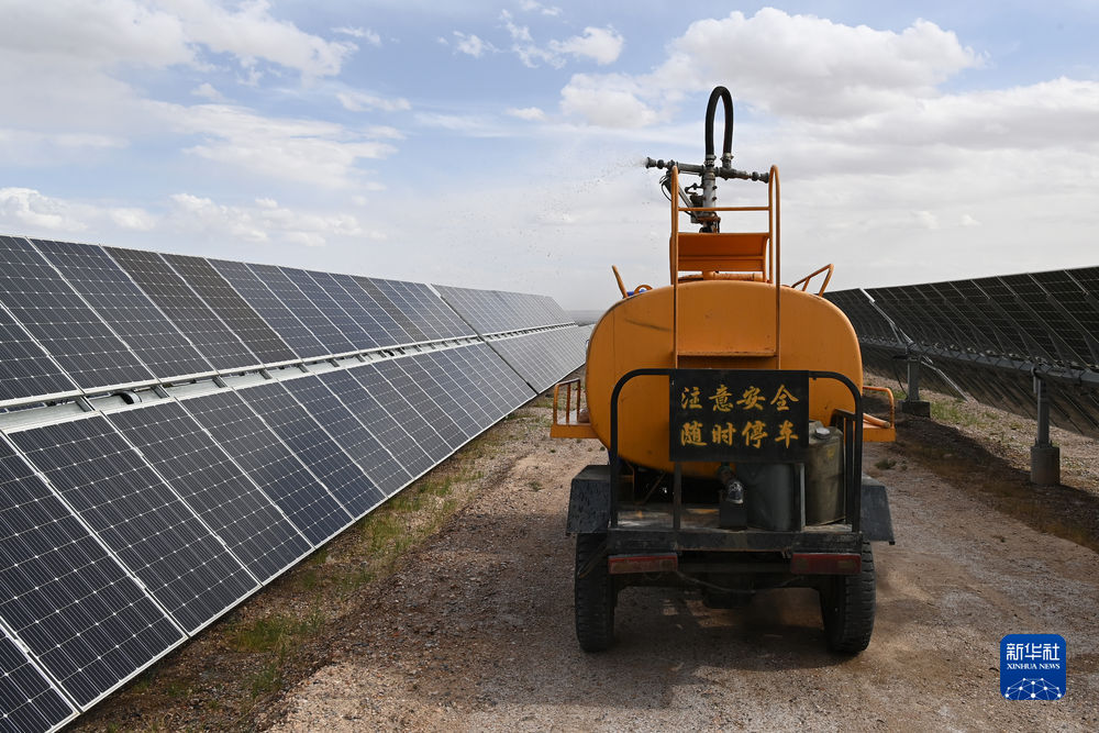 6月7日,在海西蒙古族藏族自治州德令哈市光伏(光熱)產(chǎn)業(yè)園的一家光伏電站,工作人員準(zhǔn)備駕駛車輛清潔光伏板。新華社記者 范培珅 攝