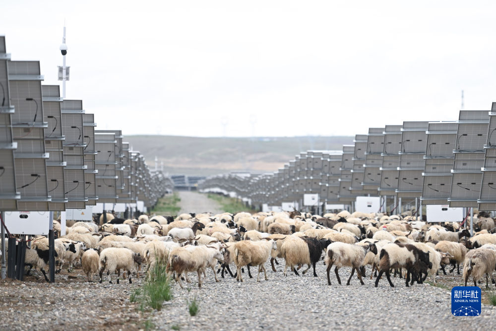 6月9日,一群羊在塔拉灘華能青海公司光伏電站內活動。新華社記者 駱曉飛 攝