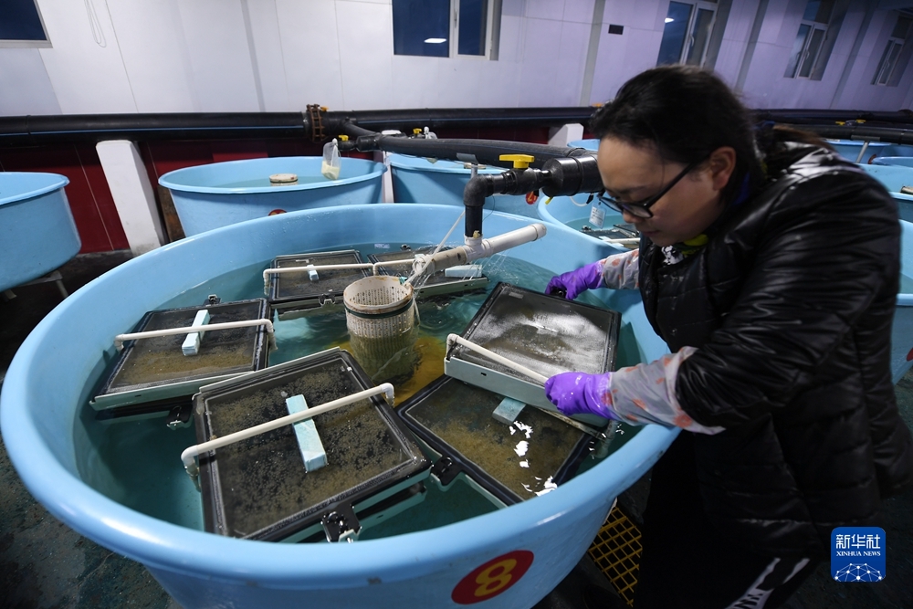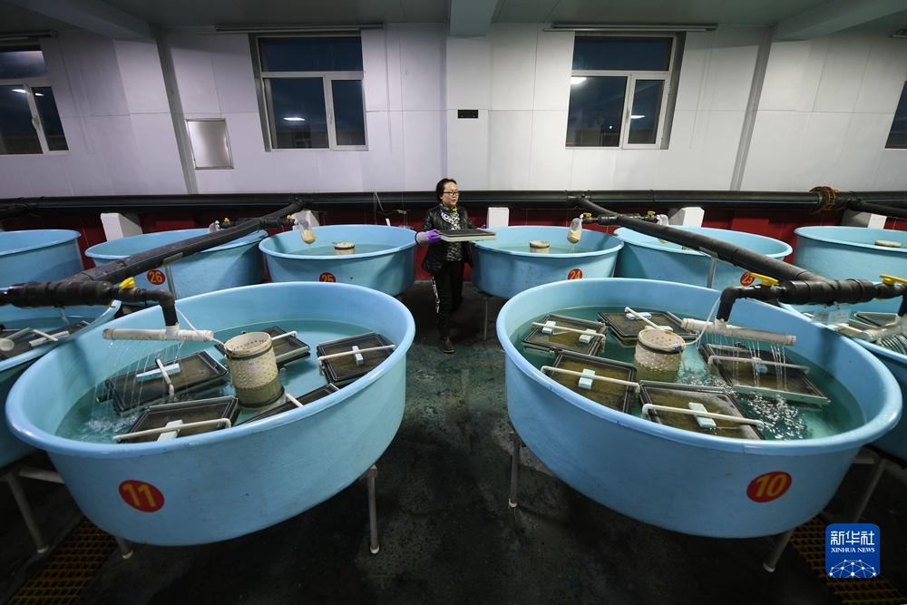 6月29日,在青海湖裸鯉沙柳河泉吉河增殖實(shí)驗(yàn)站,工作人員查看圓形破膜缸中湟魚受精卵破膜情況。新華社記者 范培珅 攝