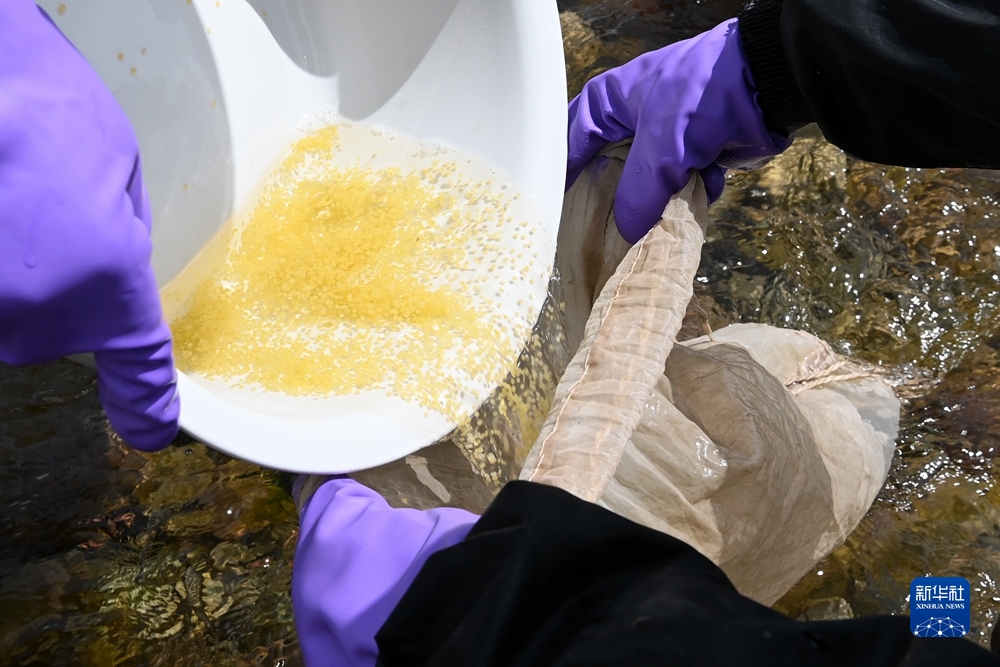 6月29日,工作人員在剛察縣境內(nèi)的泉吉河將湟魚受精卵裝入收集網(wǎng)袋。新華社記者 范培珅 攝