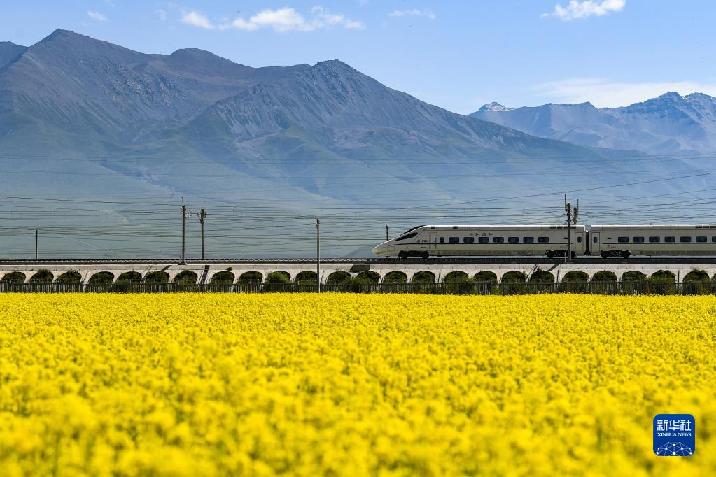 7月3日,列車駛過(guò)青海省海北藏族自治州門源回族自治縣境內(nèi)的油菜花田。新華社記者 張龍 攝