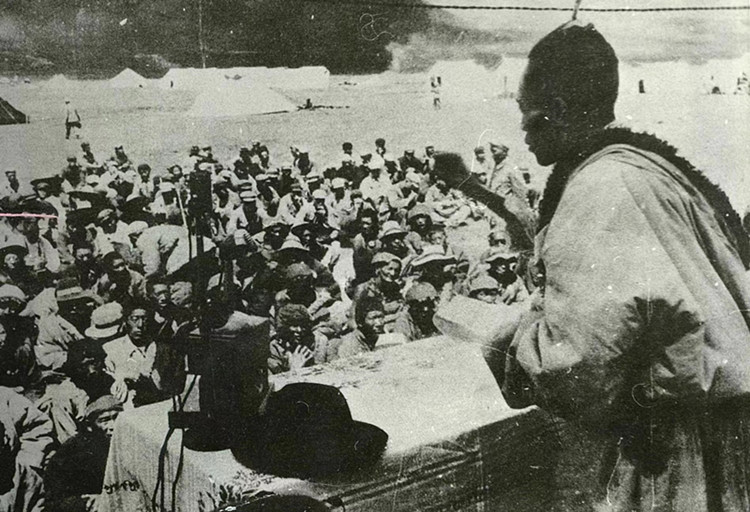 圖為1952年8月工作團(tuán)在達(dá)日縣查郎寺召開(kāi)果洛頭人、代表聯(lián)誼會(huì)議,扎喜旺徐團(tuán)長(zhǎng)在聯(lián)誼會(huì)議上作有關(guān)民族團(tuán)結(jié)的報(bào)告。圖片由央金提供
