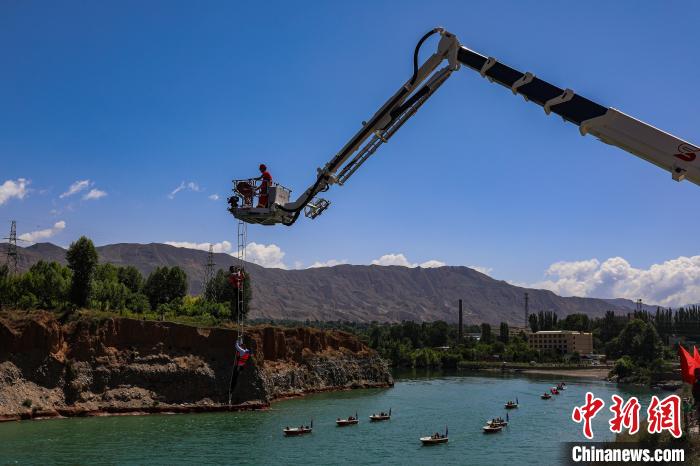 圖為演練現(xiàn)場,登高平臺消防車負角度峽谷救援。黃開森 攝