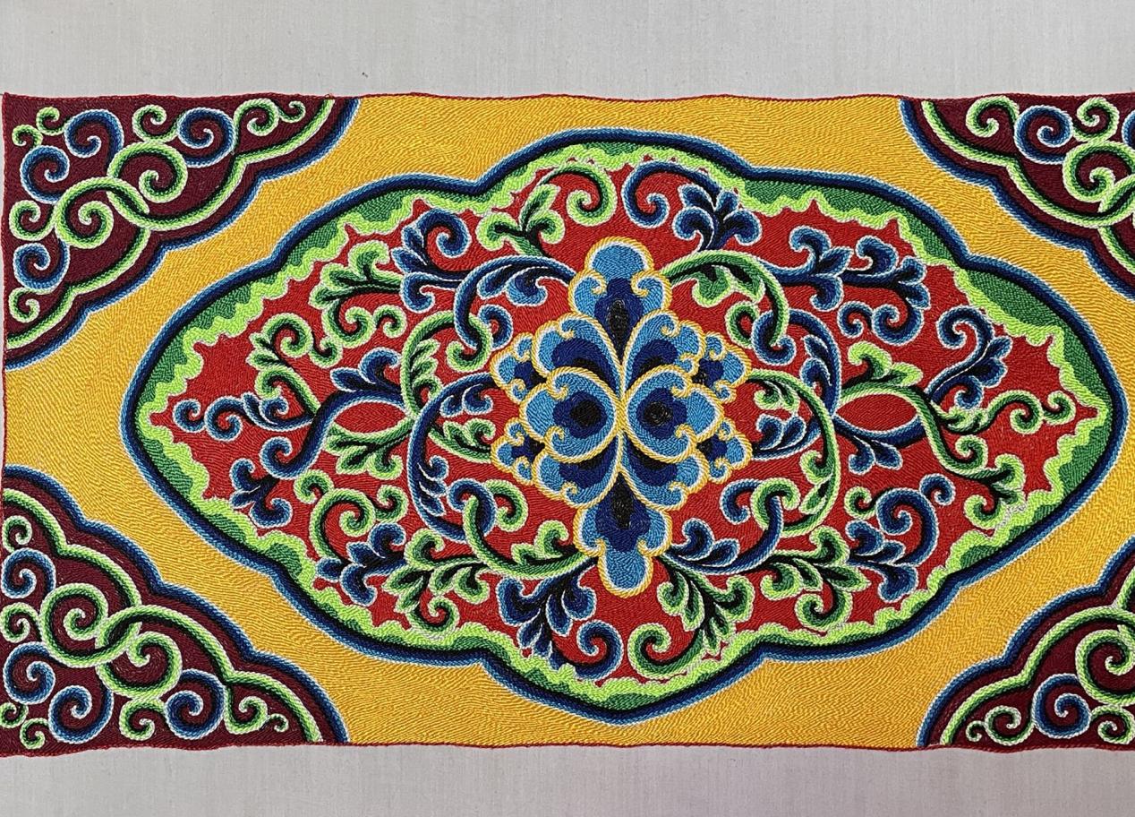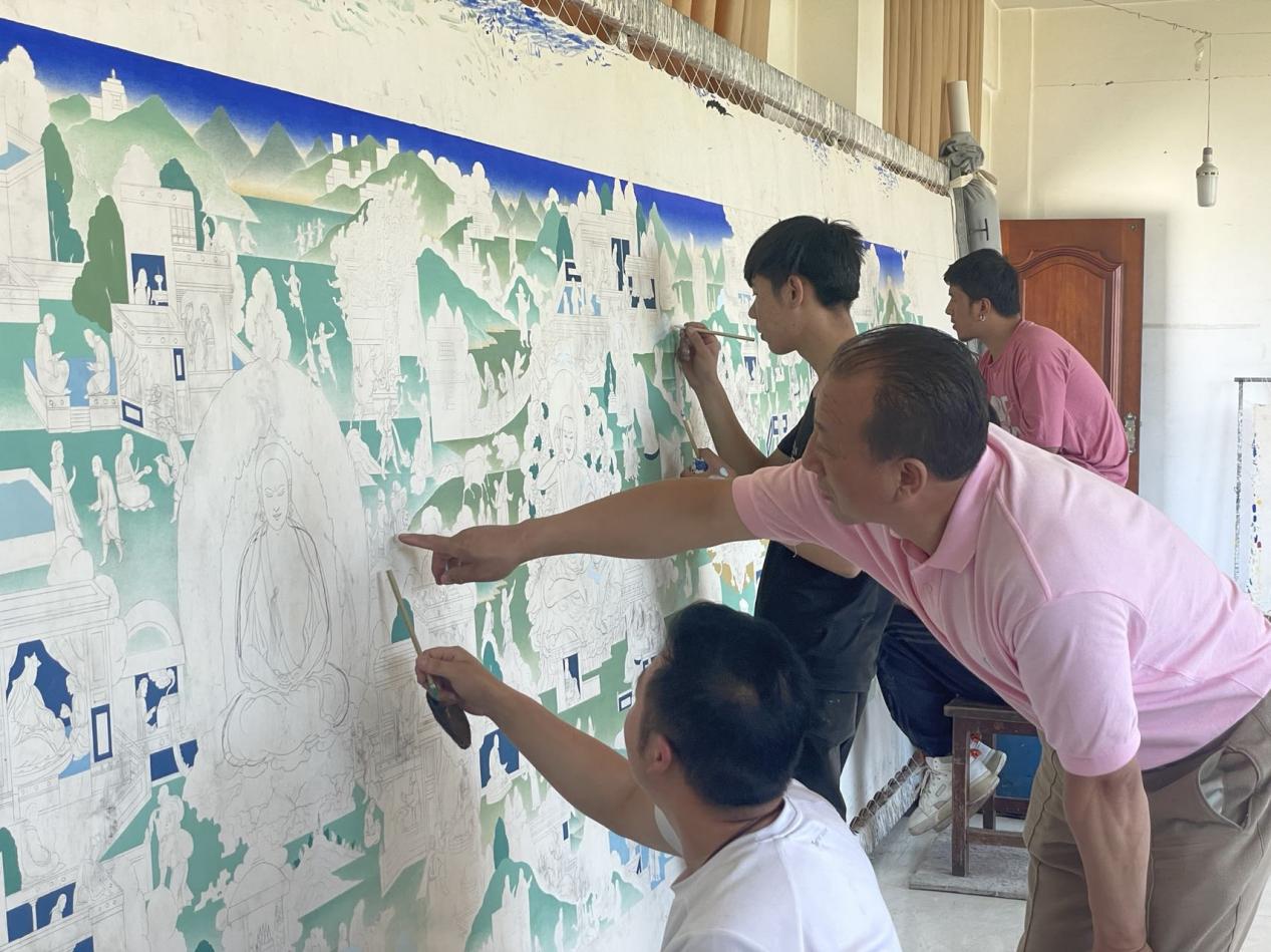 “目前我主要是在做建筑彩繪,我想把這些圖案都運(yùn)用到我們的建筑當(dāng)中,熱貢藝術(shù)(建筑彩繪)也就能更好地傳承下去了。”更登在彩繪創(chuàng)作中融入了清代旋子畫法和明代和璽畫法,形成了自己獨(dú)特的彩繪風(fēng)格,曾設(shè)計(jì)并完成了甘肅省政府及水銀樓兩個(gè)項(xiàng)目的彩繪工程。
