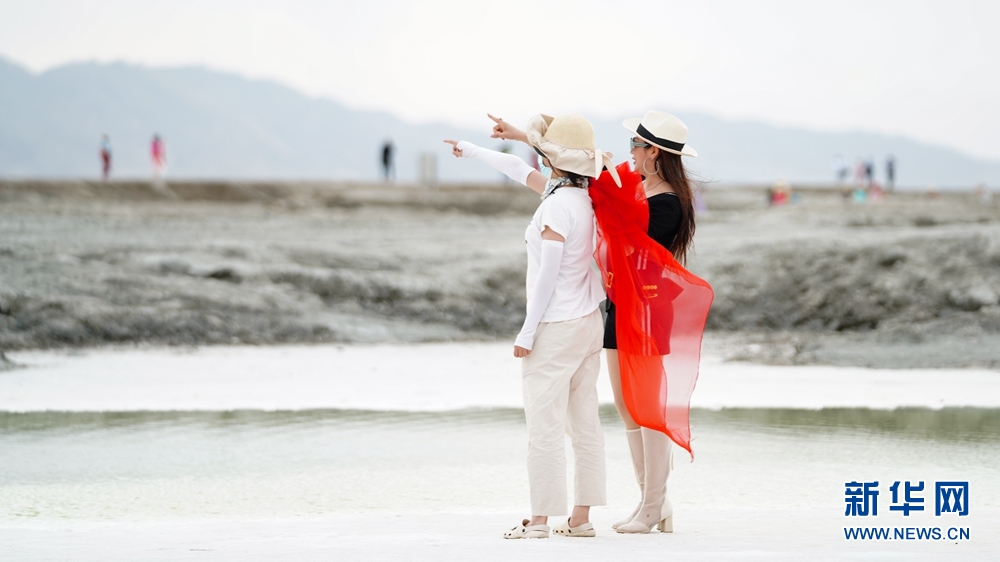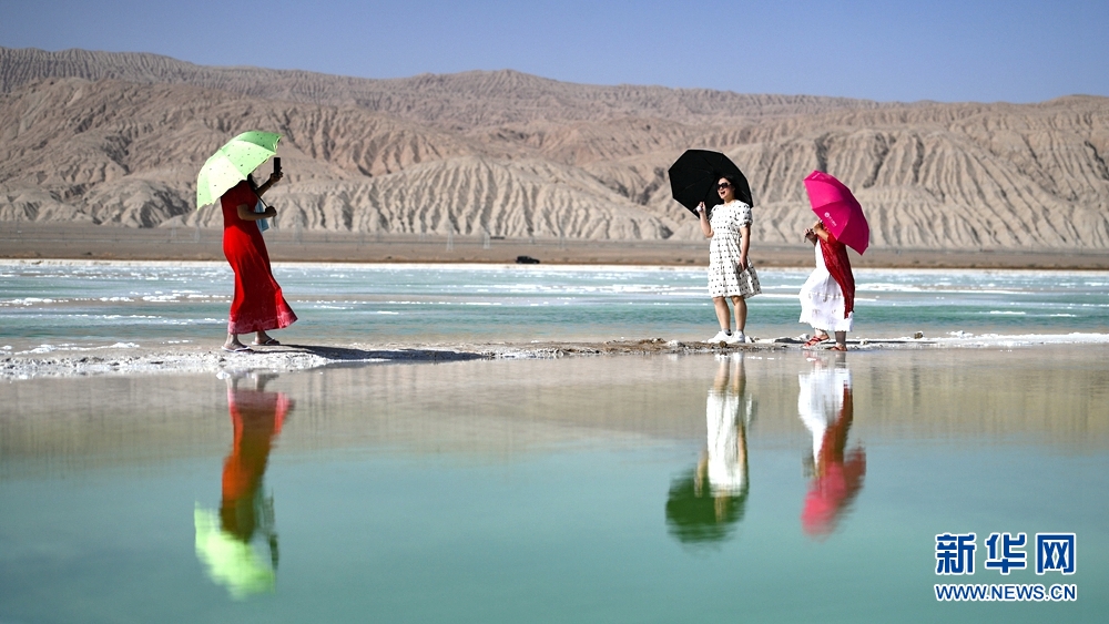 7月20日,游客在海西州大柴旦行委境內(nèi)的翡翠湖游玩。