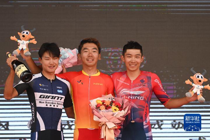 7月31日,獲得當(dāng)日賽段前三的甘肅體彩隊選手彭鑫(中)、捷安特洲際隊選手吳俊杰(左)、李寧之星洲際隊選手牛益逵在領(lǐng)獎臺上合影。新華社記者 張龍 攝