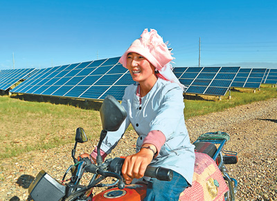 落日余暉中,牧民索南卓瑪騎著一輛摩托車(chē),沿著歸家的方向,緩緩跟在羊群后面?!白詮难b了光伏板,生態(tài)治理同步發(fā)力,一些戈壁灘變成了綠地,我們的生活也越來(lái)越好了。”對(duì)眼前土地發(fā)生的變化,生于斯長(zhǎng)于斯的索南卓瑪深有感觸。