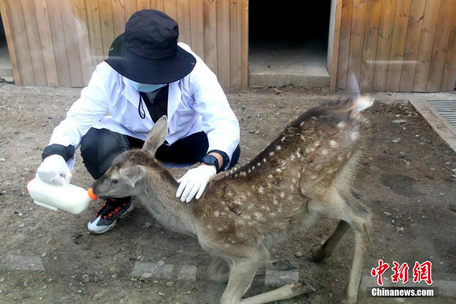 在祁連山國(guó)家公園青海片區(qū)野生動(dòng)物救護(hù)繁育中心內(nèi),工作人員正在給馬鹿喂奶。新華網(wǎng) 卡婭梅朵 攝