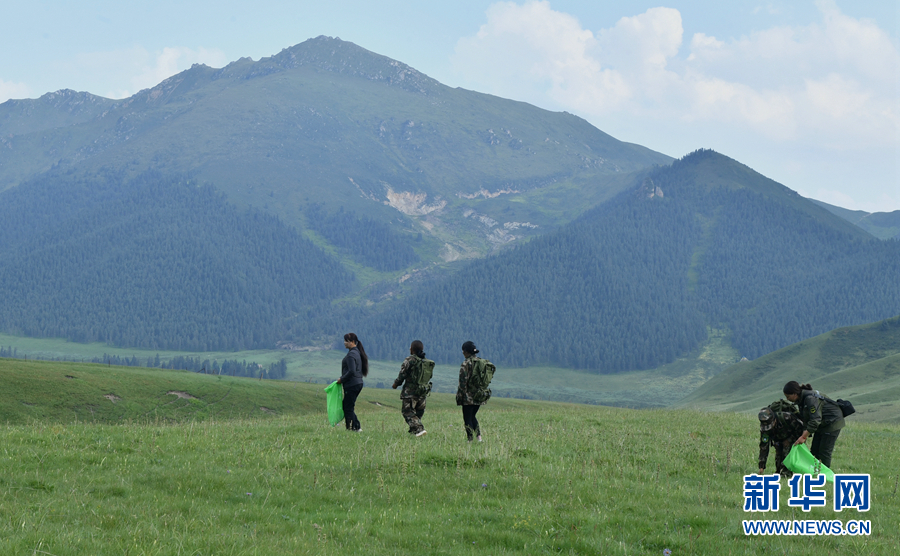 圖為祁連山國家公園青海片區(qū)青陽溝管護(hù)站生態(tài)管護(hù)員在草原上撿拾垃圾。新華網(wǎng) 卡婭梅朵 攝