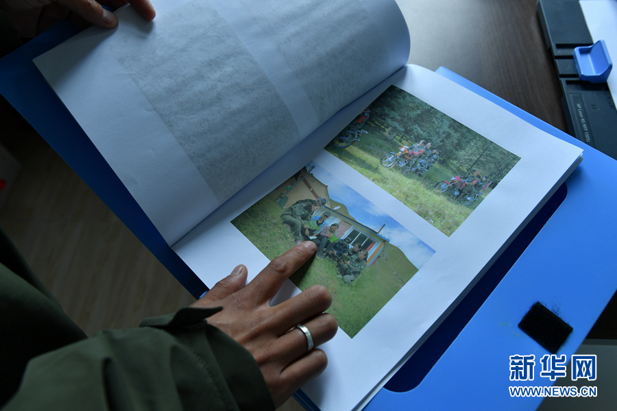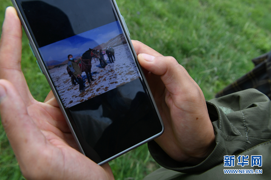 圖為代吉桑毛向記者展示冬季巡護(hù)中拍攝的工作照。新華網(wǎng) 卡婭梅朵 攝