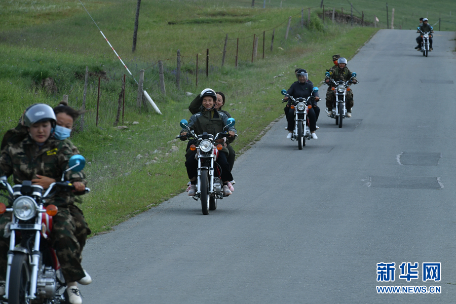 圖為代吉桑毛和隊(duì)員們準(zhǔn)備騎摩托車出發(fā)。新華網(wǎng) 卡婭梅朵 攝