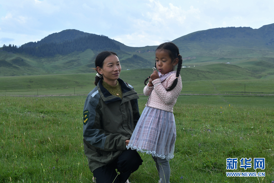 圖為工作之余,代吉桑毛和女兒一起在草原上玩耍。新華網(wǎng) 卡婭梅朵 攝