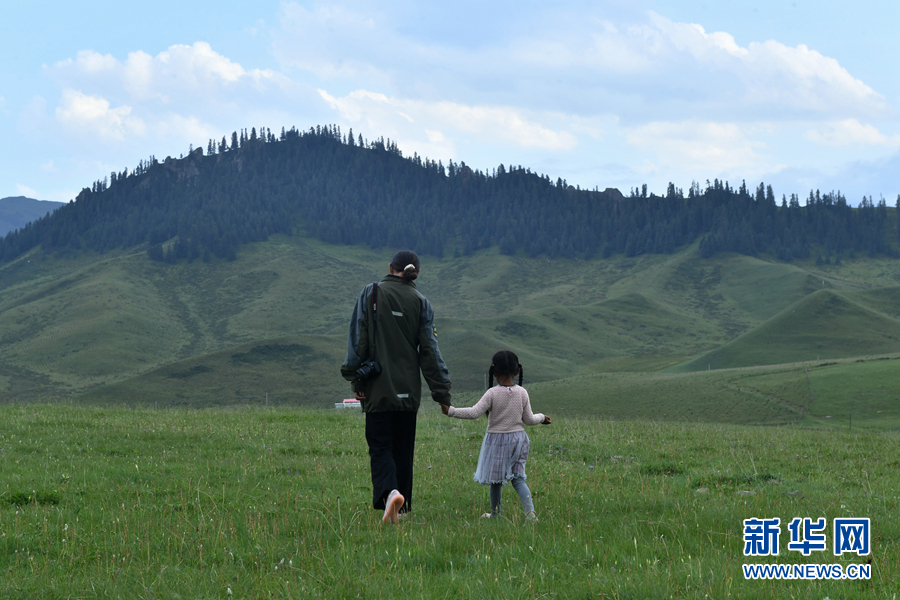圖為代吉桑毛和女兒在草原上散步。新華網(wǎng) 卡婭梅朵 攝