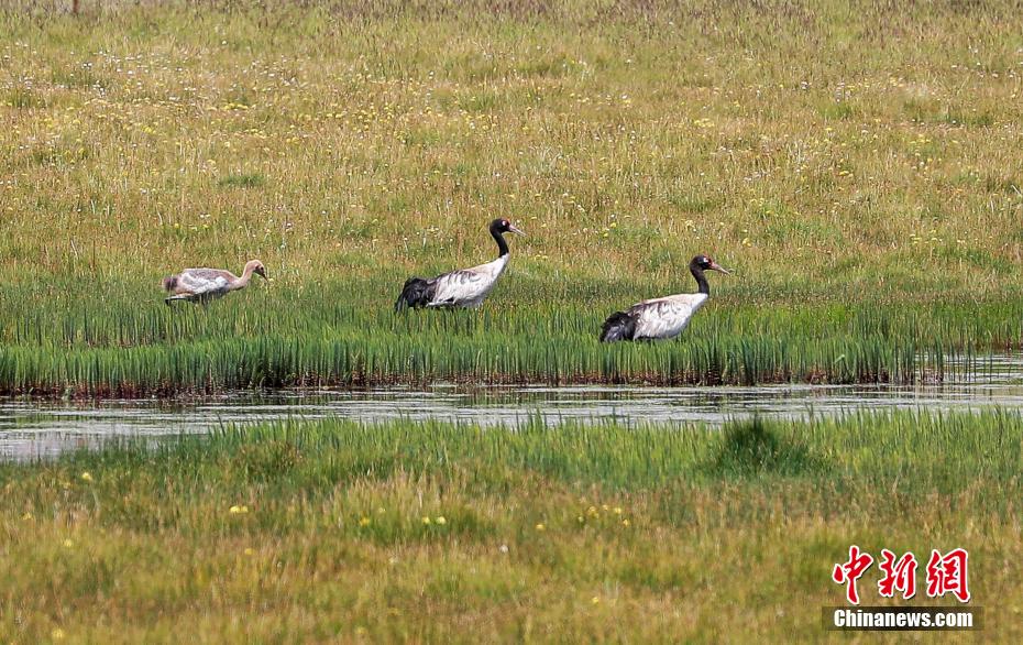 8月9日,祁連山南麓的青海省海北藏族自治州祁連縣央隆鄉(xiāng),三只黑頸鶴正在央隆濕地悠閑踱步,不時(shí)發(fā)出鳴叫聲。黑頸鶴是大型飛行涉禽,頸的上部為黑色,故稱(chēng)黑頸鶴。每年,黑頸鶴在春季遷徙到繁殖地,秋季到達(dá)越冬地,是世界上唯一生長(zhǎng)、繁殖在高原的鶴。
