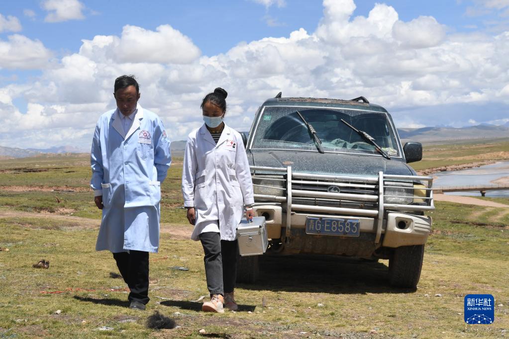 在治多縣索加鄉(xiāng)當曲村,布久索南更青(左)和同事前往牧民家中問診(8月11日攝)。新華社記者 范培珅 攝