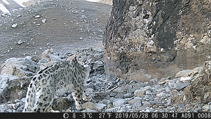 “我時常覺得,與其說是我們觀察雪豹,不如說是雪豹在觀察我們,它觀察我們,比我們觀察它要容易得多?!睋?jù)王大軍講述,有一次,團(tuán)隊追蹤到一只雪豹的身影停留在山間,但遠(yuǎn)遠(yuǎn)望去,只有一條尾巴露在外面。通過攝影設(shè)備拉近畫面,才發(fā)現(xiàn)原來那只雪豹的雙眼也正在透過巖石的縫隙,觀察著他們。