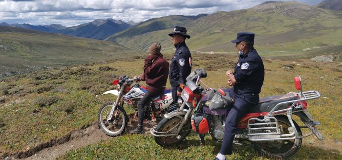 禾尼鄉(xiāng)派出所接到求助后,立即安排在附近開(kāi)展工作的草原騎警隊(duì)警力寧紅玉、澤仁公布、格絨降措帶領(lǐng)熟悉附近地形的派出所群防群治義警隊(duì)員丁真稱(chēng)乃,騎摩托車(chē)趕赴現(xiàn)場(chǎng)。期間,草原騎警隊(duì)協(xié)調(diào)附近牧民租借3臺(tái)摩托車(chē)前往迷路地方尋找,因迷路地點(diǎn)在海拔4800多米的高山,草原騎警隊(duì)翻山越嶺,經(jīng)過(guò)3個(gè)多小時(shí)的尋找,與迷路人員家屬在一山坳處找到德洛。家屬滿含熱淚的看著草原騎警隊(duì)隊(duì)員說(shuō),“麻煩你們了,謝謝你們了,你們辛苦了?!?/p>